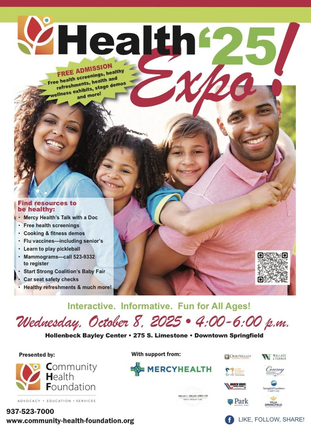 Join us for the Community Health Foundation HEALTH EXPO ‘25 being held Wednesday, October 8, 2025, from 4:00-6:00pm at Hollenbeck Bayley Conference Center, 275 S. Limestone Street in downtown Springfield. This is a free, interactive event for all ages.